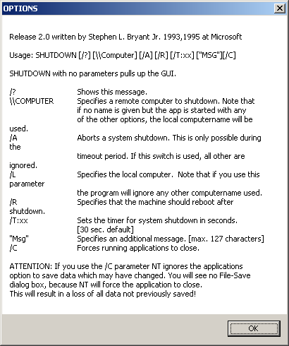 On remote host (in this case machine called vmprg021) a message box is shown counting down (30 seconds) to shutdown. Remote machine will when adding /R to command line.